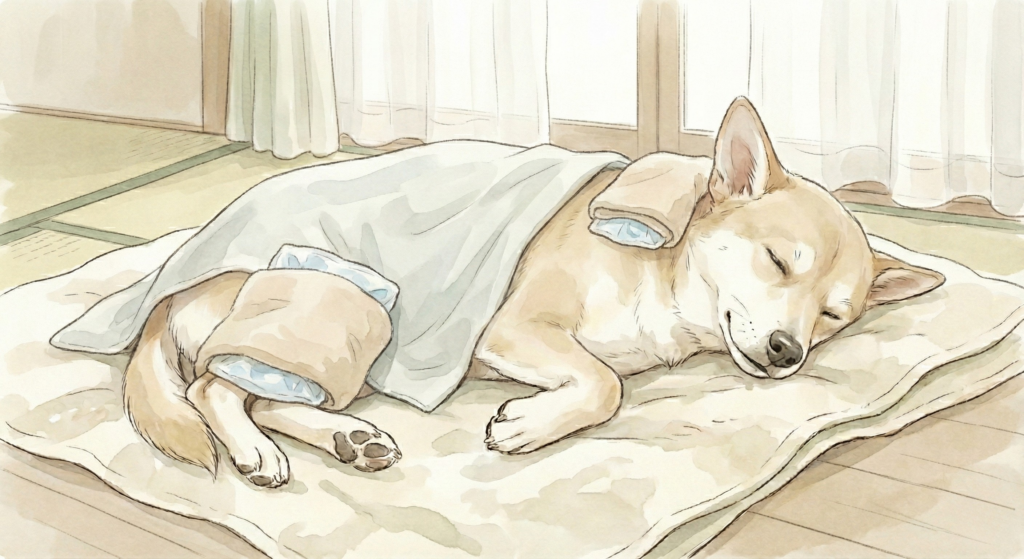 保冷剤や氷をビニール袋に入れ、タオルで巻いたものを、お体の周りに置いて冷やします。特に傷みやすいお腹まわりと頭部を中心に冷やしてあげてください。