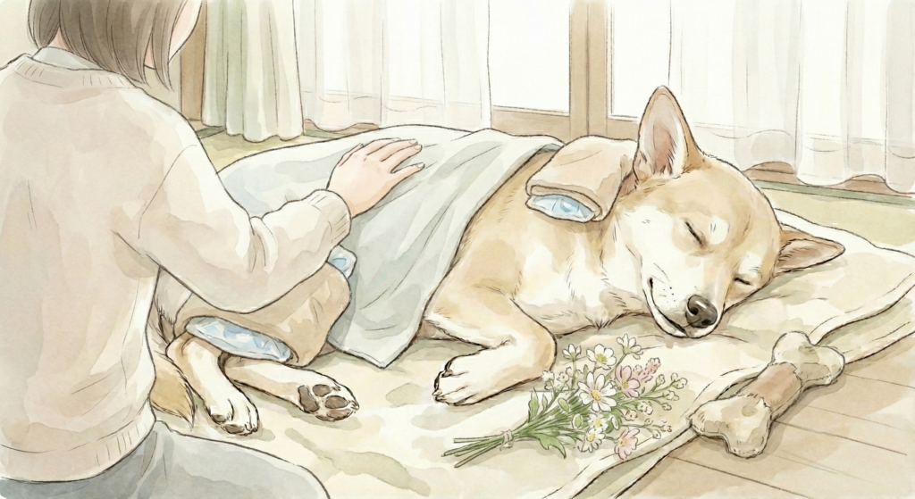 お気に入りだったおもちゃや、お花をそっと添えてあげてください。 優しく体を撫でたり、「ありがとう」「お疲れさま」と声をかけてあげましょう。 これまでの幸せな日々に感謝を伝え、静かに見守る大切な時間をお過ごしください。